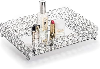 Feyarl Crystal Vanity Makeup Perfume Tray Ornate Jewelry Trinket Organizer Cosmetic Decorative Tray Skin Care Storage for Home Dressing Table Wedding DecorationRectangle 12 x 8 Silver
