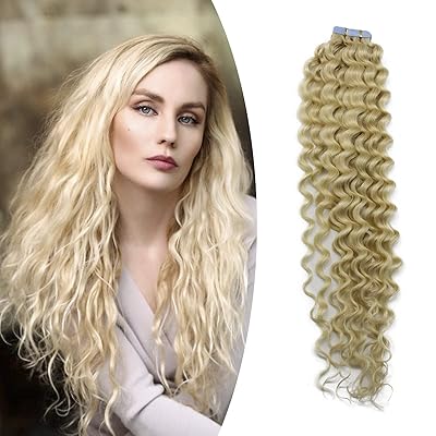 Invisible Seamless Tape in Hair Extensions Skin Weft Curly Remy Human Hair Platinum Blonde 18inch20Pcs