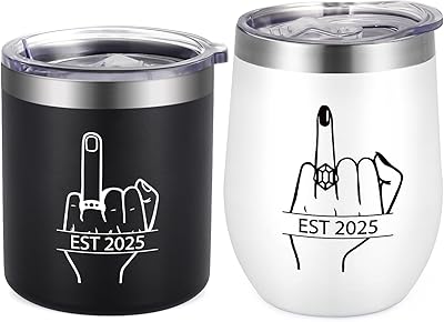 Qtencas Wedding Gifts for Couple, Ring Finger EST 2025 Stainless Steel Whiskey & Wine Tumbler Gift Set, Unique Engagement Gifts for Couples Mr Mrs His and Her Just Married Gift, 12oz Black & White