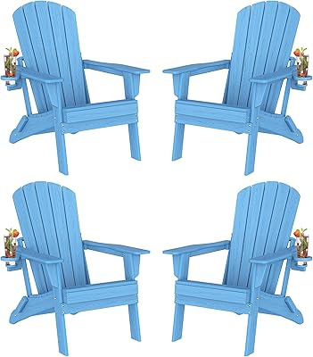 Plawdlik Folding Adirondack Chair Set of 4 with Cup Holder, SGS Tested, HDPE Heavy All-Weather,Wooden Textured,Backyard Fire Pit, Light Blue